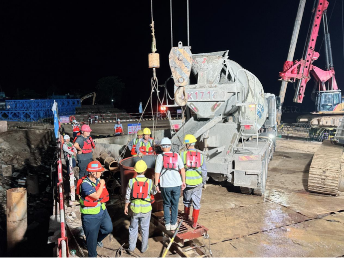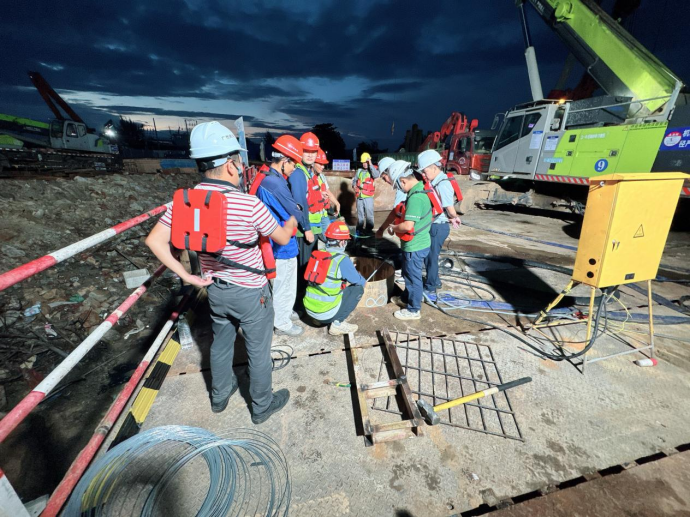 在施工現(xiàn)場,建設(shè)團(tuán)隊嚴(yán)格依照標(biāo)準(zhǔn)化施工流程推進(jìn)作業(yè)。從施打鋼護(hù)筒筑牢基礎(chǔ)防線,到旋挖機(jī)精準(zhǔn)鉆孔;從初次清孔、鋼筋籠精準(zhǔn)下放,再到安裝導(dǎo)管、二次清孔,直至完成水下混凝土澆筑,每一個環(huán)節(jié)都經(jīng)過精密測算與嚴(yán)格把控。過程中,建設(shè)單位園區(qū)公司、監(jiān)理單位、施工單位三方組成專項攻堅小組,全程駐守現(xiàn)場,通過技術(shù)交底、實(shí)時監(jiān)測、動態(tài)調(diào)整,全力確保澆筑過程萬無一失。