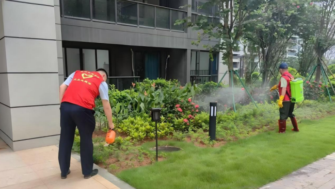 東灣綠城小區(qū)人口密集,防控任務(wù)重。服務(wù)公司迅速啟動應(yīng)急預(yù)案,組織黨員志愿者與物業(yè)人員組成專項保潔小組,按片區(qū)劃分責(zé)任區(qū),對公共活動區(qū)、綠化帶等重點區(qū)域全方位排查整治。他們清理垃圾、清空積水容器、疏通下水道,規(guī)范噴灑藥劑,還通過多種渠道普及防控知識,提升住戶防護意識。