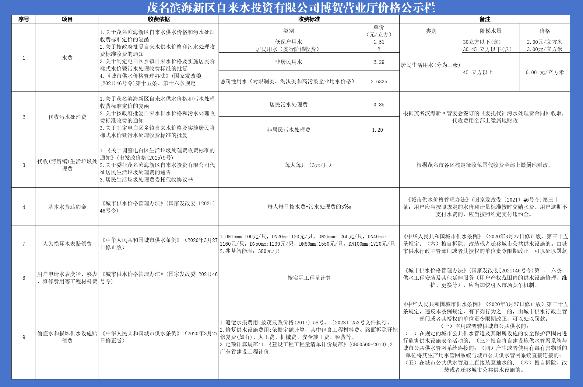 水是生命之源,更是保障日常生活與生產(chǎn)經(jīng)營的重要基礎(chǔ)。為切實(shí)保障每一位用戶的合法權(quán)益,進(jìn)一步規(guī)范自來水收費(fèi)服務(wù)流程,提升收費(fèi)透明度,讓大家明明白白消費(fèi),茂名濱海新區(qū)自來水投資有限公司現(xiàn)將旗下電城鎮(zhèn)營業(yè)廳、博賀鎮(zhèn)營業(yè)廳的自來水收費(fèi)標(biāo)準(zhǔn)、計(jì)費(fèi)方式等核心信息進(jìn)行集中公示。
